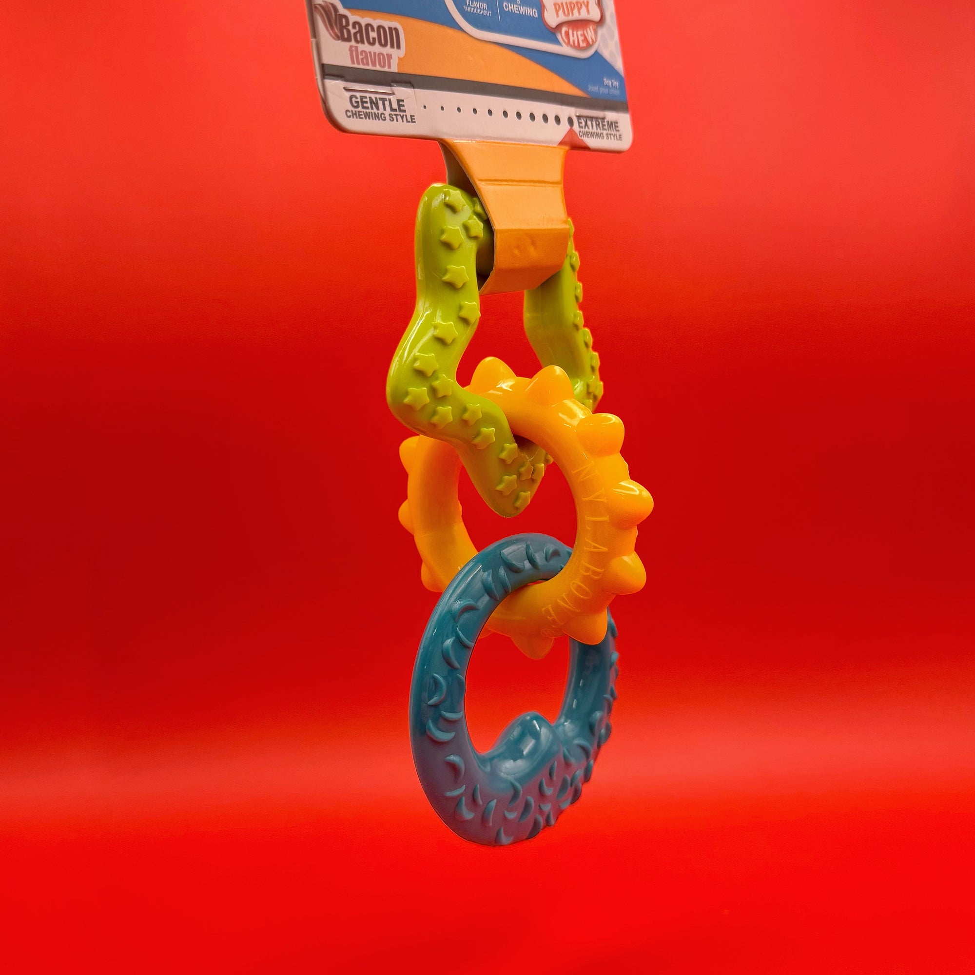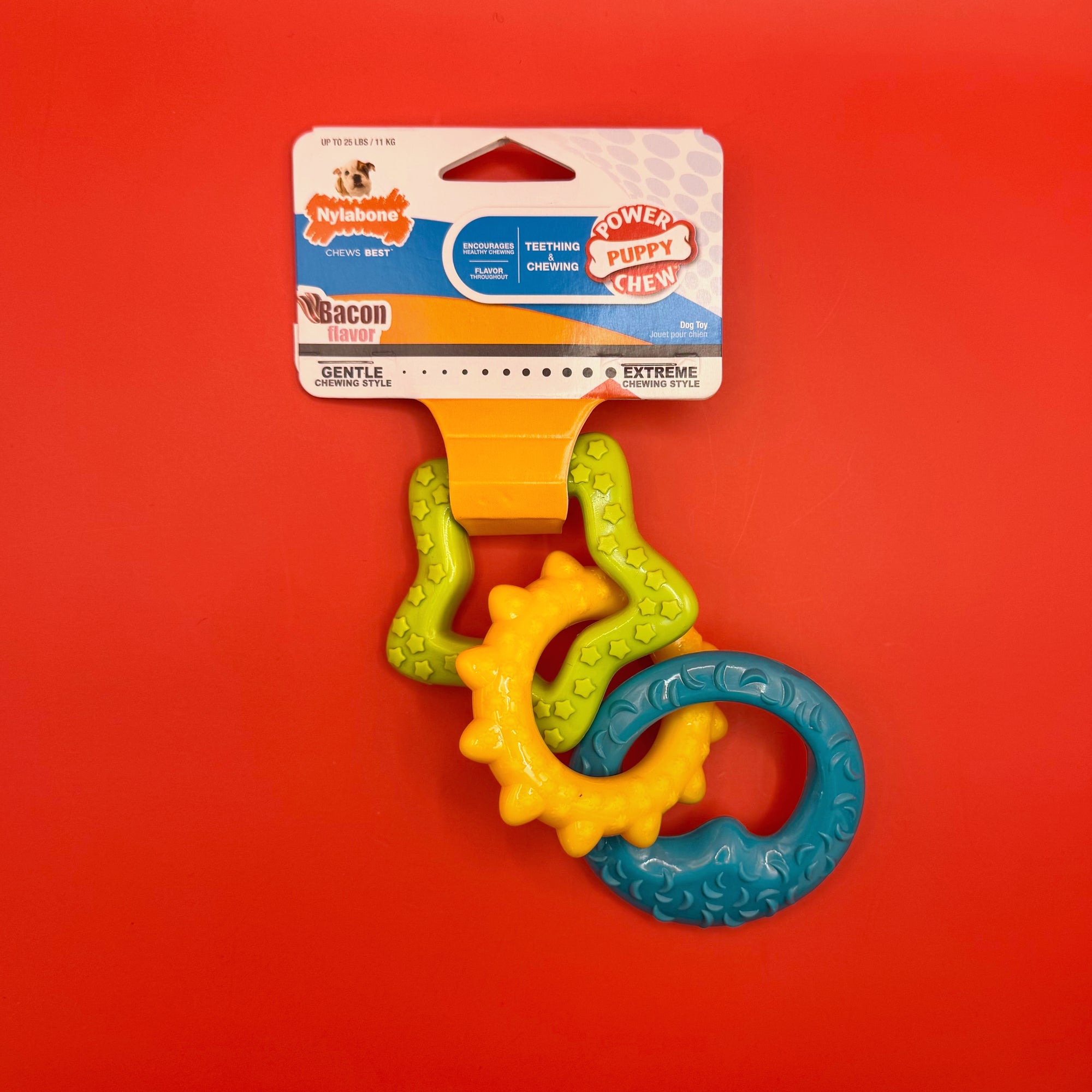 Keep your puppy happily occupied with the Nylabone Teething Chew Rings: a flavour-packed chew designed to soothe sore gums and satisfy the urge to gnaw. Irresistible bacon flavour and a satisfying texture make this one chew your puppy won't want to put down.