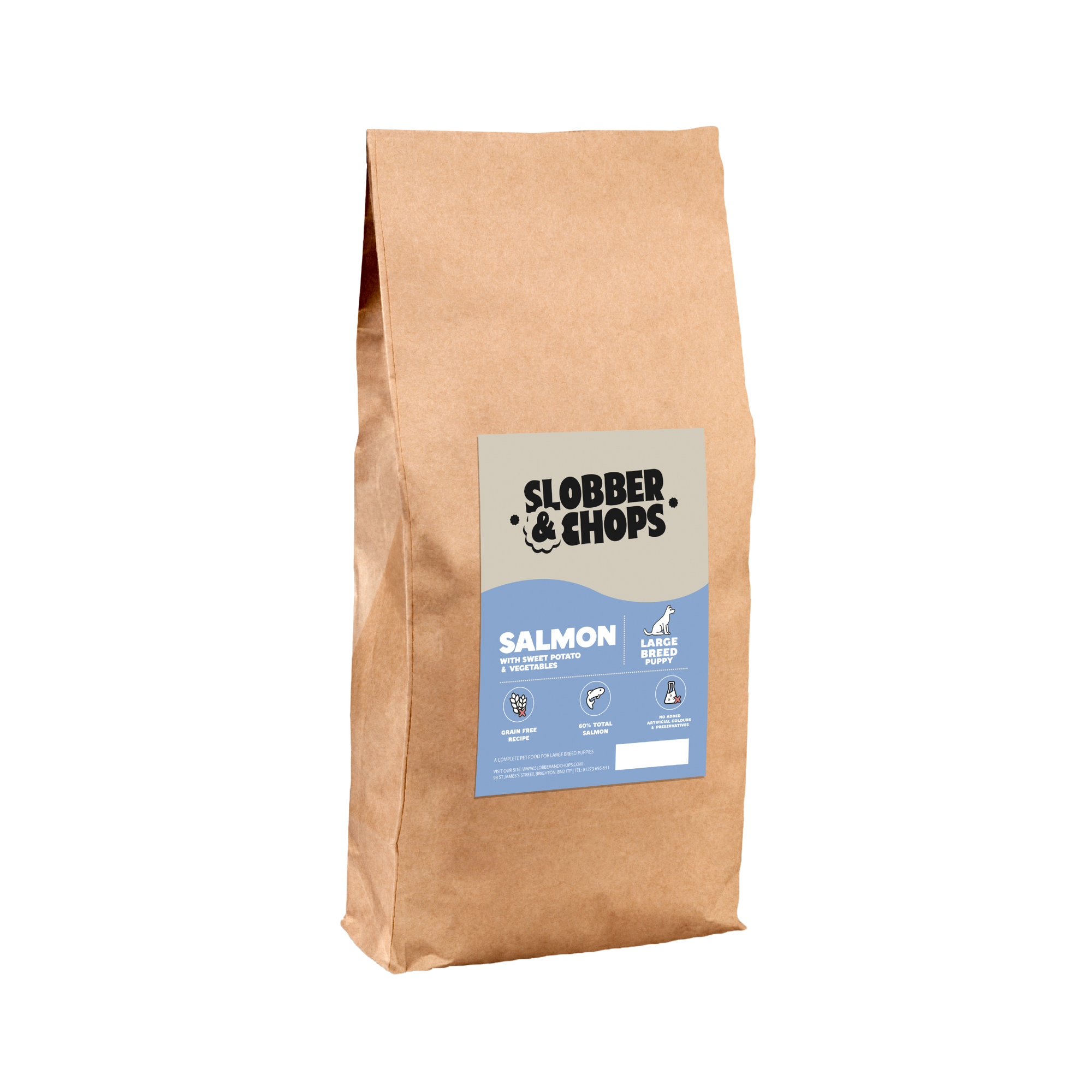 Our Big Bite Puppy Salmon & Garden Vegetable grain-free recipe is 50% fish, including freshly prepared salmon, sweet potato, carrots, and peas and has been specifically created for larger breed puppies.